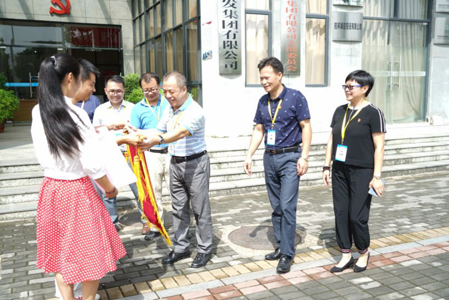 2018年9月18日上午,臨桂鎮(zhèn)花堽小學(xué)校長(zhǎng)秦開勝、黨支部書記秦海燕將一面印有“捐資助學(xué),無尚光榮”的錦旗送到新城投資集團(tuán)。集團(tuán)公司黨支部書記周道林、集團(tuán)經(jīng)營(yíng)班子、支部委員一起接受錦旗。