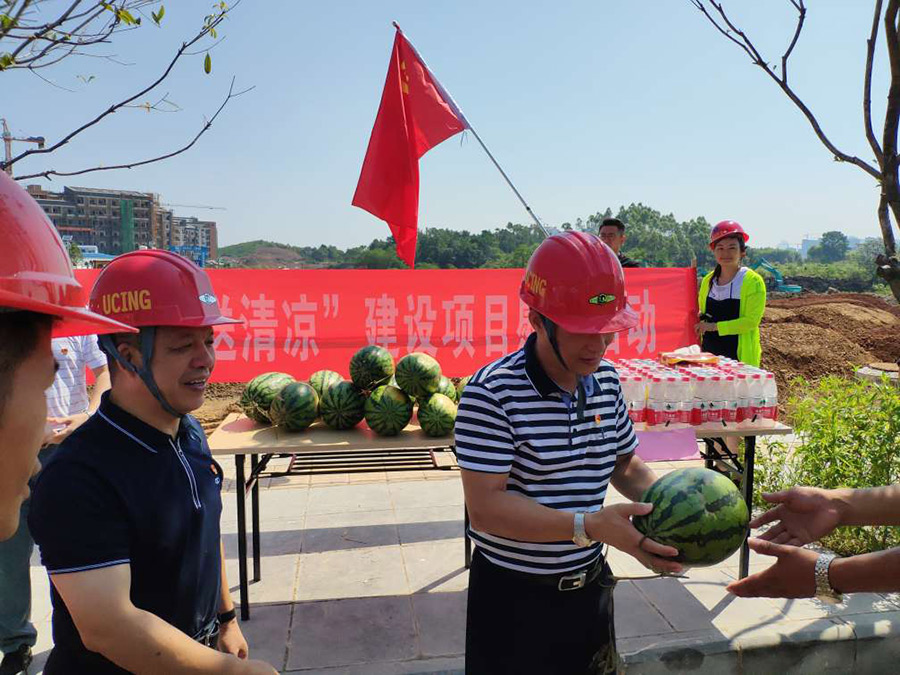臨桂新區(qū)工委副書記、新區(qū)管委會(huì)副主任、新區(qū)黨總支書記唐標(biāo)明,臨桂新區(qū)工委委員、新區(qū)管委會(huì)副主任、機(jī)關(guān)工會(huì)主席文杰,新城投資集團(tuán)黨支部書記周道林,臨桂新區(qū)工委組織人事部部長(zhǎng)、黨總支紀(jì)檢委員梁利,新城投資集團(tuán)黨支部委員、新城投資集團(tuán)工會(huì)主席譚力源等領(lǐng)導(dǎo)將西瓜、飲用水等防暑降溫用品送到一線建筑工人手中。