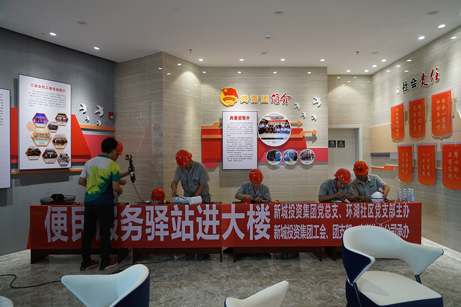 在中華人民共和國成立70周年即將來臨之際,9月30日上午,新城投資集團(tuán)黨總支聯(lián)合環(huán)湖社區(qū)黨支部、宏謀物業(yè)公司在新城投資集團(tuán)辦公大樓一樓舉辦“‘不忘初心、牢記使命’便民服務(wù)驛站進(jìn)大樓志愿服務(wù)活動(dòng)”,為在本大樓辦公的總工會(huì)、水利局、司法局員工提供小家電維修服務(wù),黨員以實(shí)際行動(dòng)踐行為身邊群眾辦實(shí)事、辦好事?;顒?dòng)在新城投資集團(tuán)黨總支、環(huán)湖社區(qū)黨支部全體黨員合唱的《我和我的祖國》歌聲中啟動(dòng),大家用嘹亮的歌聲、真摯的情感抒發(fā)出對(duì)偉大祖國的最美好的祝愿!集團(tuán)黨總支籌備工作領(lǐng)導(dǎo)小組組長、董事長周道林,黨總支籌備工作領(lǐng)導(dǎo)小組副組長、副總經(jīng)理鄧仁友,環(huán)湖社區(qū)第一書記蔡燕,環(huán)湖社區(qū)黨支部書記、居委會(huì)主任李伊倩出席了活動(dòng)。
