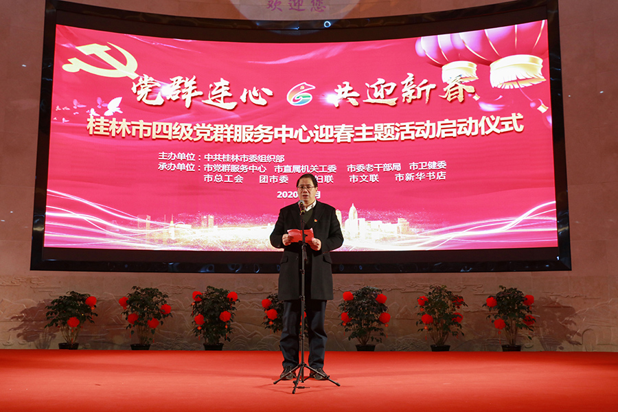 為豐富和活躍全市人民精神文化生活,營造歡樂、祥和、文明、健康的節(jié)日氛圍,桂林市四級黨群服務(wù)中心“黨群連心 共迎新春”主題活動于1月15日在市黨群服務(wù)中心舉行隆重的啟動儀式。新城投資集團(tuán)黨支部書記、董事長周道林應(yīng)邀參加迎新活動。