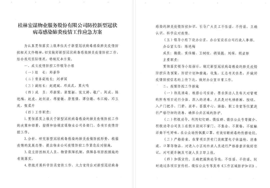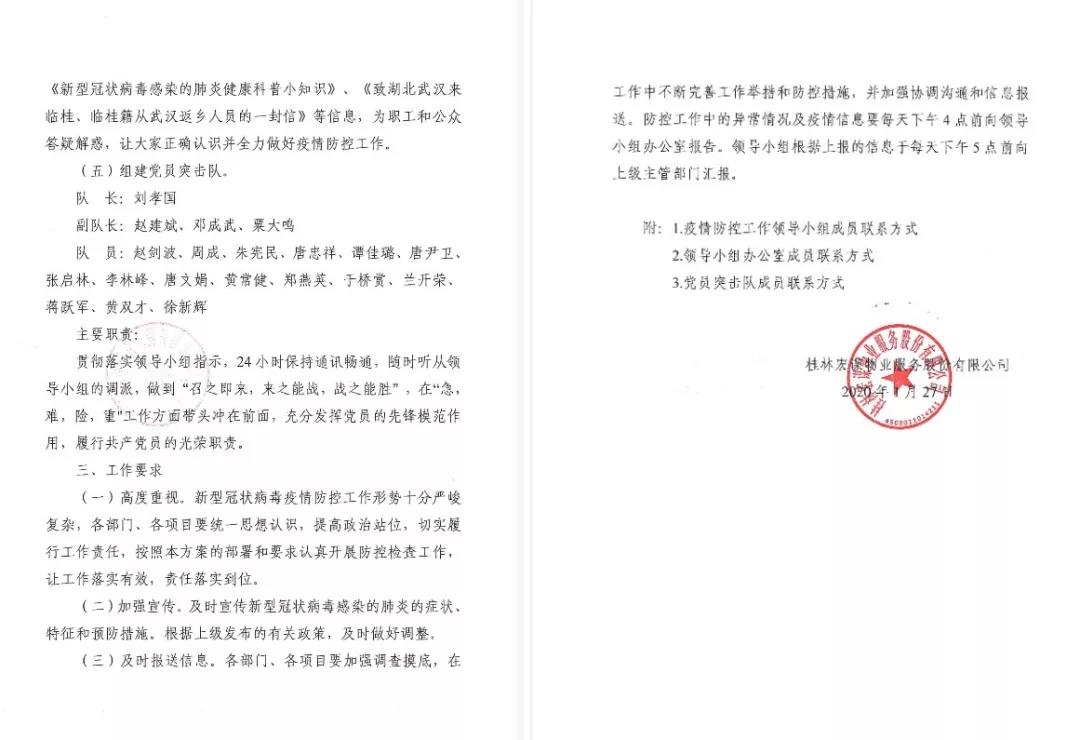 一、為認(rèn)真貫徹落實(shí)上級單位關(guān)于新型冠狀病毒感染肺炎疫情防控相關(guān)文件精神,將疫情防控工作落到實(shí)處,宏謀物業(yè)制定《桂林宏謀物業(yè)服務(wù)股份有限公司防控新型冠狀病毒感染肺炎疫情工作應(yīng)急方案》,成立疫情防控工作領(lǐng)導(dǎo)小組,以便統(tǒng)籌指揮協(xié)調(diào)相關(guān)工作。同時(shí)成立以總經(jīng)理劉孝國同志任隊(duì)長的物業(yè)公司黨員突擊隊(duì),在“急,難,險(xiǎn),重"等工作面前,黨員同志帶頭沖在前面,充分發(fā)揮黨員的先鋒模范作用,履行共產(chǎn)黨員的光榮職責(zé)。