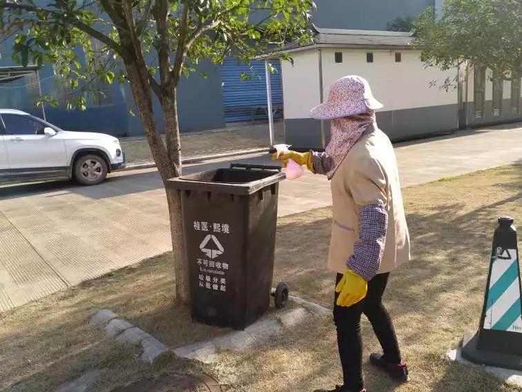 ▲桂醫(yī)·熙境項(xiàng)目對電梯、單元樓大廳、客服中心等地噴灑消毒水。