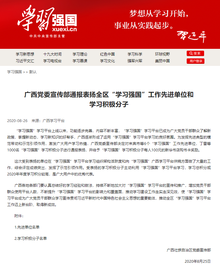 附:《廣西黨委宣傳部通報(bào)表?yè)P(yáng)全區(qū)“學(xué)習(xí)強(qiáng)國(guó)”工作先進(jìn)單位和學(xué)習(xí)積極分子》