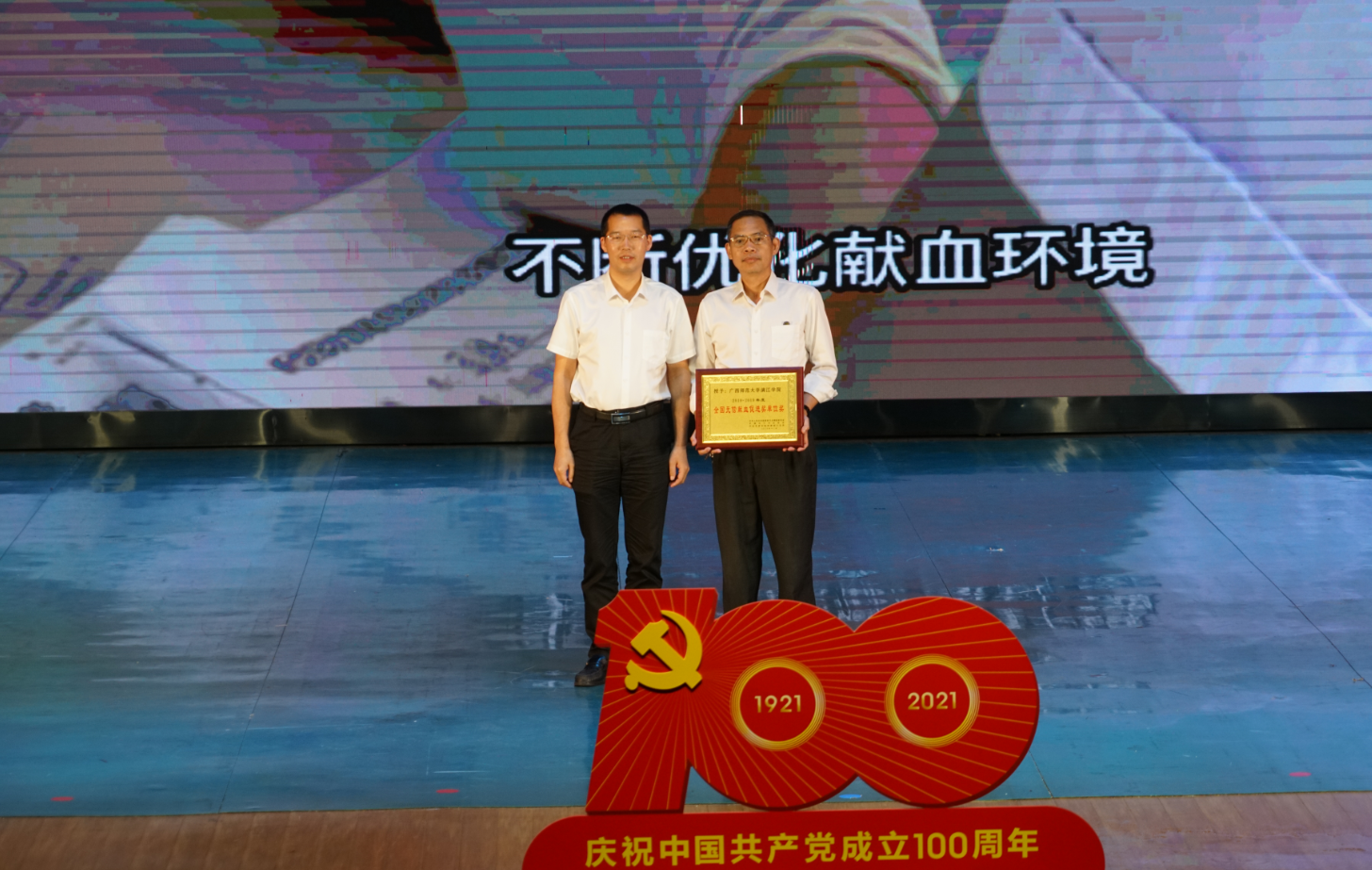 6月9日,由桂林市獻血委員會、桂林市衛(wèi)生健康委員會、桂林市紅十字會、中國人民解放軍聯(lián)勤保障部隊桂林聯(lián)勤保障中心衛(wèi)勤處主辦,桂林市中心血站、廣西師范大學(xué)漓江學(xué)院承辦的“喜迎建黨100周年桂林市慶祝2021年世界獻血者日無償獻血表彰文藝匯演”活動在漓江學(xué)院召開。漓江學(xué)院獲得全場唯一“全國無償獻血促進獎單位獎”。