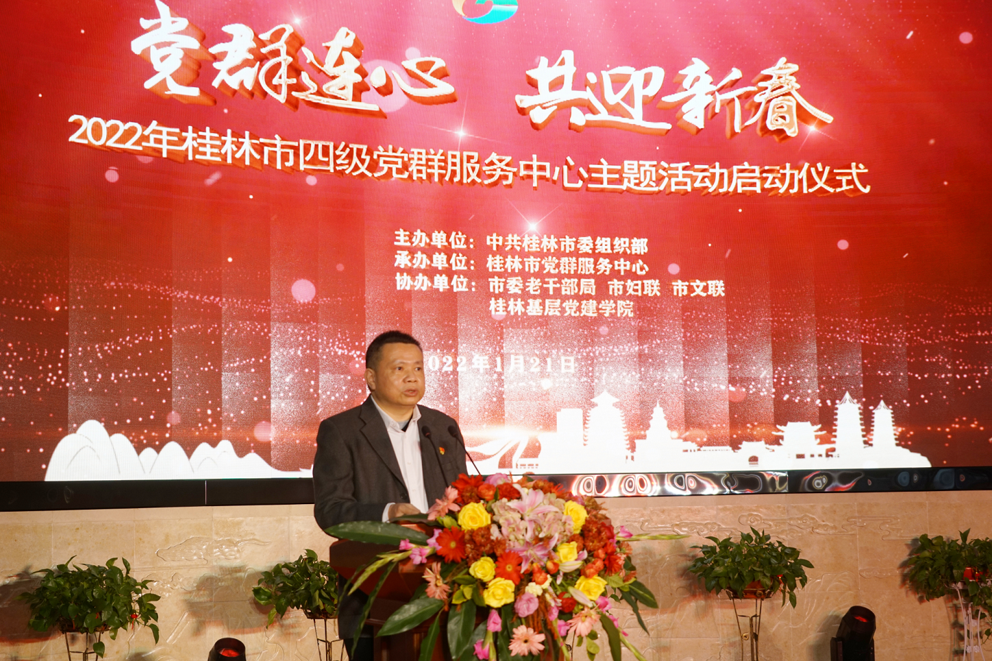 2022年1月21日,由中共桂林市委組織部主辦,市黨群服務(wù)中心承辦,市委老干部局、團(tuán)市委、市文聯(lián)、桂林基層黨建學(xué)院協(xié)辦的“黨群連心 共迎新春”桂林市四級黨群服務(wù)中心迎春主題活動啟動儀式在桂林市黨群服務(wù)中心舉行。市委常委、組織部部長趙衛(wèi)東,市黨群服務(wù)中心分管領(lǐng)導(dǎo),各城區(qū)黨委組織部部長等出席活動。新城投資集團(tuán)黨總支書記、董事長、桂林市基層黨建學(xué)院副院長、桂林市黨的建設(shè)研究會第五屆理事會理事周道林參加活動。