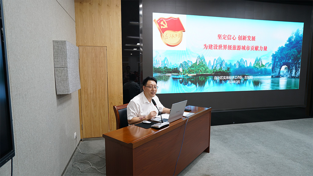 在活動中,左旭陽還給大家上了一堂有思想、有深度、有意義的黨課。黨課以《堅定信心 創(chuàng)新發(fā)展 為建設(shè)世界級旅游城市貢獻力量》為題,從多個方面進行了深入的講解和闡述。他重點解讀了《中國共產(chǎn)黨紀律處分條例》,強調(diào)了黨風(fēng)黨紀建設(shè)的重要性和必要性;講解了《關(guān)于支持廣西加快打造國內(nèi)國際雙循環(huán)市場經(jīng)營便利地的若干措施》,探尋了發(fā)展的契機;分享了工作中的創(chuàng)新及成果感悟,提升了黨員干部干事創(chuàng)業(yè)的“精氣神”;把脈新城投集團的發(fā)展方向,增強了大家大有可為、時不我待的信心。