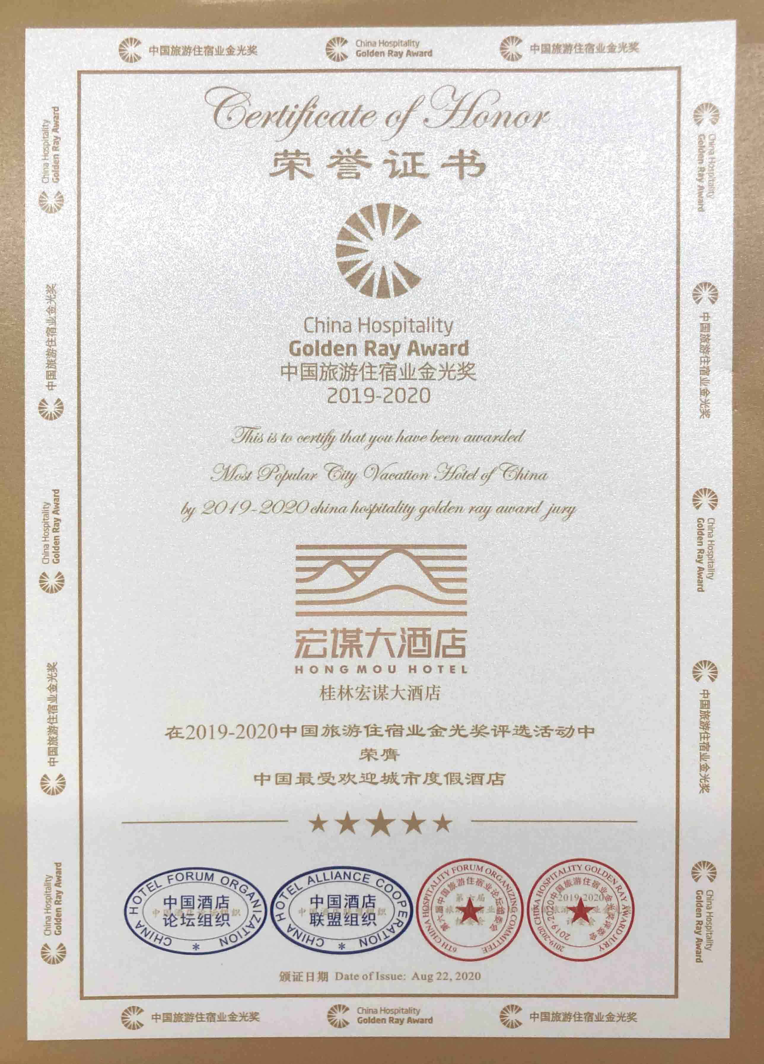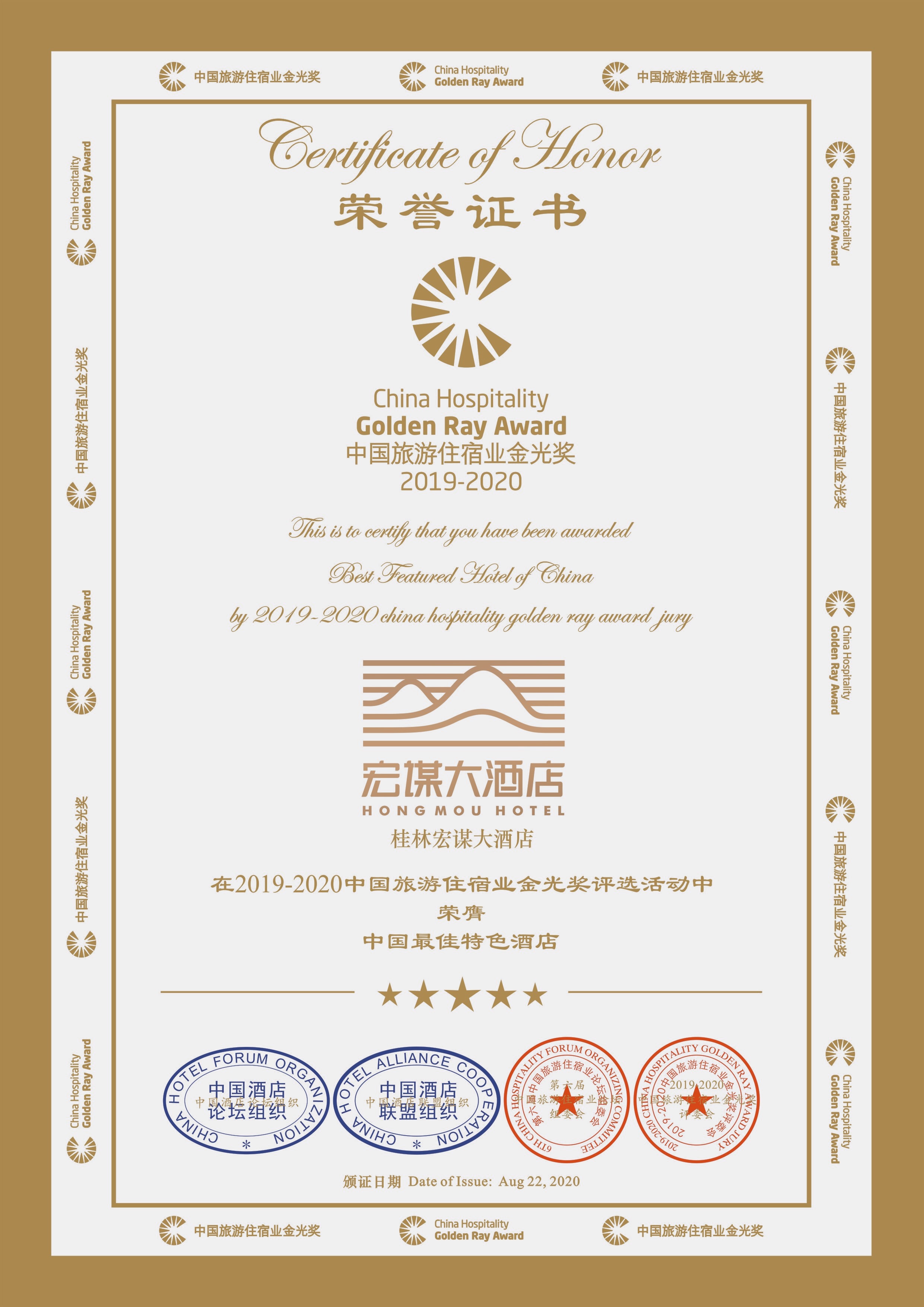 喜報(bào)!桂林宏謀大酒店榮獲中國酒店金光獎(jiǎng)兩項(xiàng)殊榮