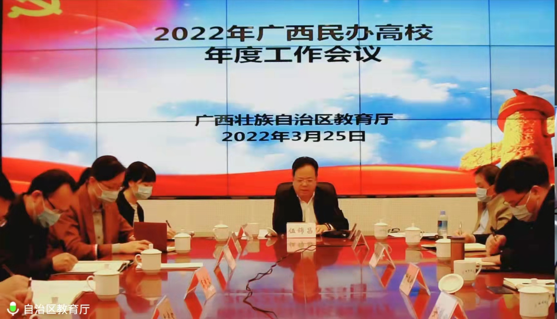 3月25日上午, 自治區(qū)教育廳召開(kāi)2022年廣西民辦高校年度工作視頻會(huì)議。自治區(qū)教育廳黨組成員、副廳長(zhǎng)伍錦昌出席會(huì)議并作重要講話,自治區(qū)教育廳民辦教育管理處處長(zhǎng)蔣國(guó)平主持會(huì)議。桂林學(xué)院董事長(zhǎng)周道林、副董事長(zhǎng)鄭善華、校長(zhǎng)楊樹(shù)喆、校黨組織書(shū)記唐文紅在各分會(huì)場(chǎng)參加會(huì)議。