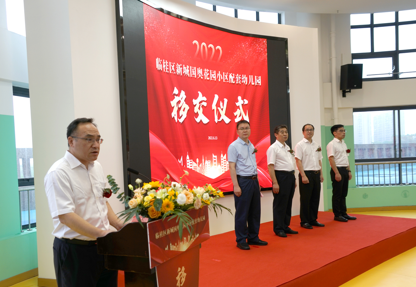 2022年6月13日,桂林市臨桂區(qū)新城國奧花園小區(qū)配套幼兒園交接儀式在幼兒園室內(nèi)小禮堂舉行。市機關事務管理局黨組書記、二級巡視員吳殷丹,市機關事務管理局局長戴波,臨桂新區(qū)黨工委委員、管委會常務副主任李星明,臨桂區(qū)常務副區(qū)長周波,新城投集團黨總支副書記、總經(jīng)理黃峻出席交接儀式?;顒佑膳R桂區(qū)蔣東兵副區(qū)長主持。
