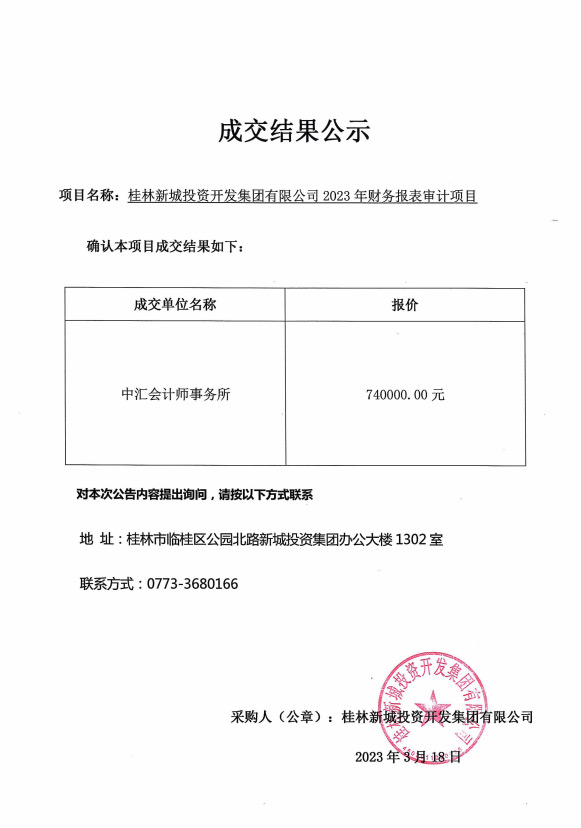 桂林新城投資開發(fā)集團有限公司2023年財務報表審計項目成交結果公示