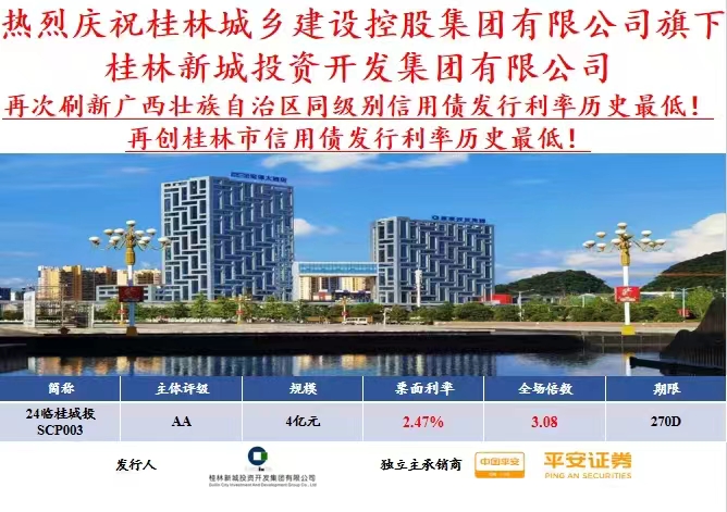 5月31日,桂林城鄉(xiāng)建設(shè)控股集團(tuán)有限公司旗下桂林新城投資開發(fā)集團(tuán)有限公司成功發(fā)行2024年度第三期超短期融資券,募集規(guī)模4億元,期限270天,票面利率2.47%,全場倍數(shù)3.08倍,由平安證券為獨(dú)立主承銷商。本期債券是新城投集團(tuán)年內(nèi)第三次刷新廣西壯族自治區(qū)同主體評級超短期融資券票面利率最低記錄,同時(shí)也是桂林市信用債發(fā)行利率歷史最低!