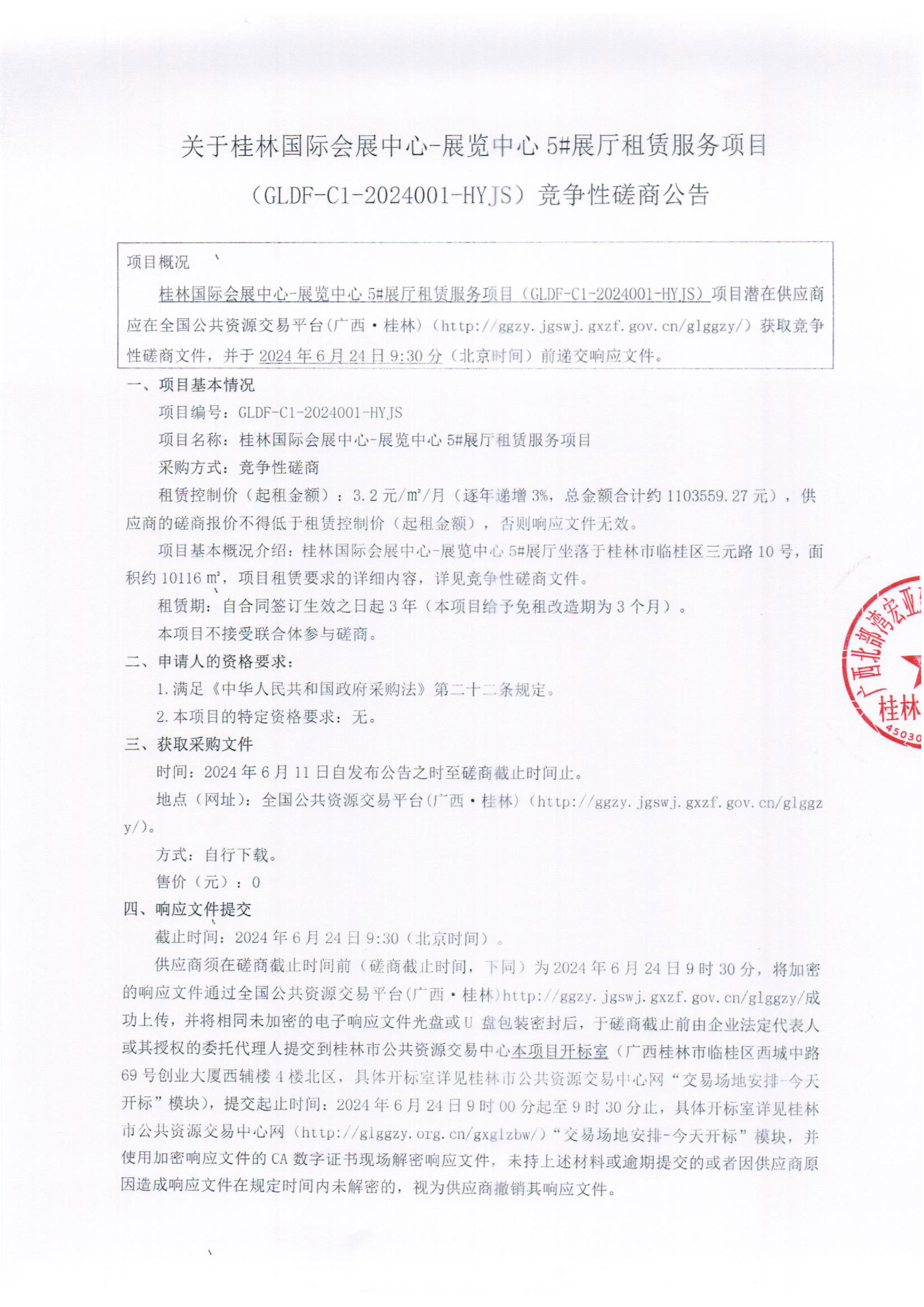 關(guān)于桂林國際會展中心-展覽中心5#展廳租賃服務(wù)項目(GLDF-C1-2024001-HYJS)競爭性磋商公告
