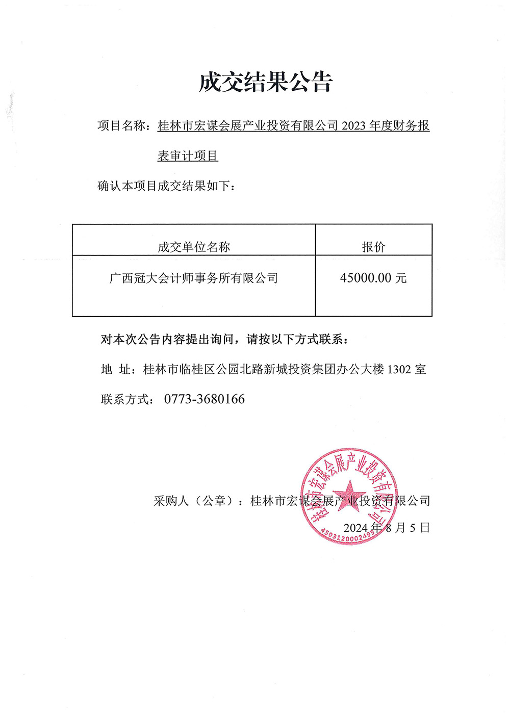 桂林市宏謀會展產(chǎn)業(yè)投資有限公司?2023年度財務報表審計項目成交結果公告