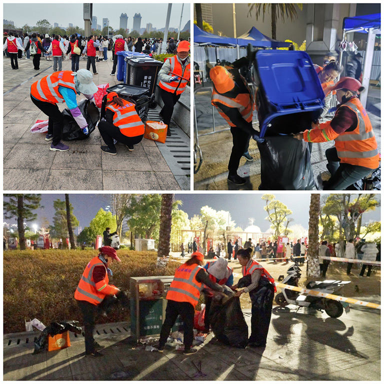 為營造整潔有序的活動氛圍,公司積極履行活動現(xiàn)場環(huán)境衛(wèi)生保障職責,出動了10余名保潔人員及2臺垃圾清運車組成“清潔衛(wèi)士”隊伍,對廣場內的塑料飯盒、礦泉水瓶、包裝袋、發(fā)光棒、煙頭等垃圾進行“地毯式”清理,同時對廣場周邊的28個垃圾桶進行合理調整布局,增加垃圾清運次數(shù),做到垃圾不堆積、不滯留。活動當天,“清潔衛(wèi)士”隊伍加大清掃頻次,延長保潔時間,及時發(fā)現(xiàn)并解決環(huán)境衛(wèi)生問題,共為800名工作、安保人員及上千名觀眾清理了260余包垃圾?;顒忧昂?2天,清理枯枝落葉、舞臺垃圾等總計達5噸,確?;顒訄龅丨h(huán)境舒適與衛(wèi)生。