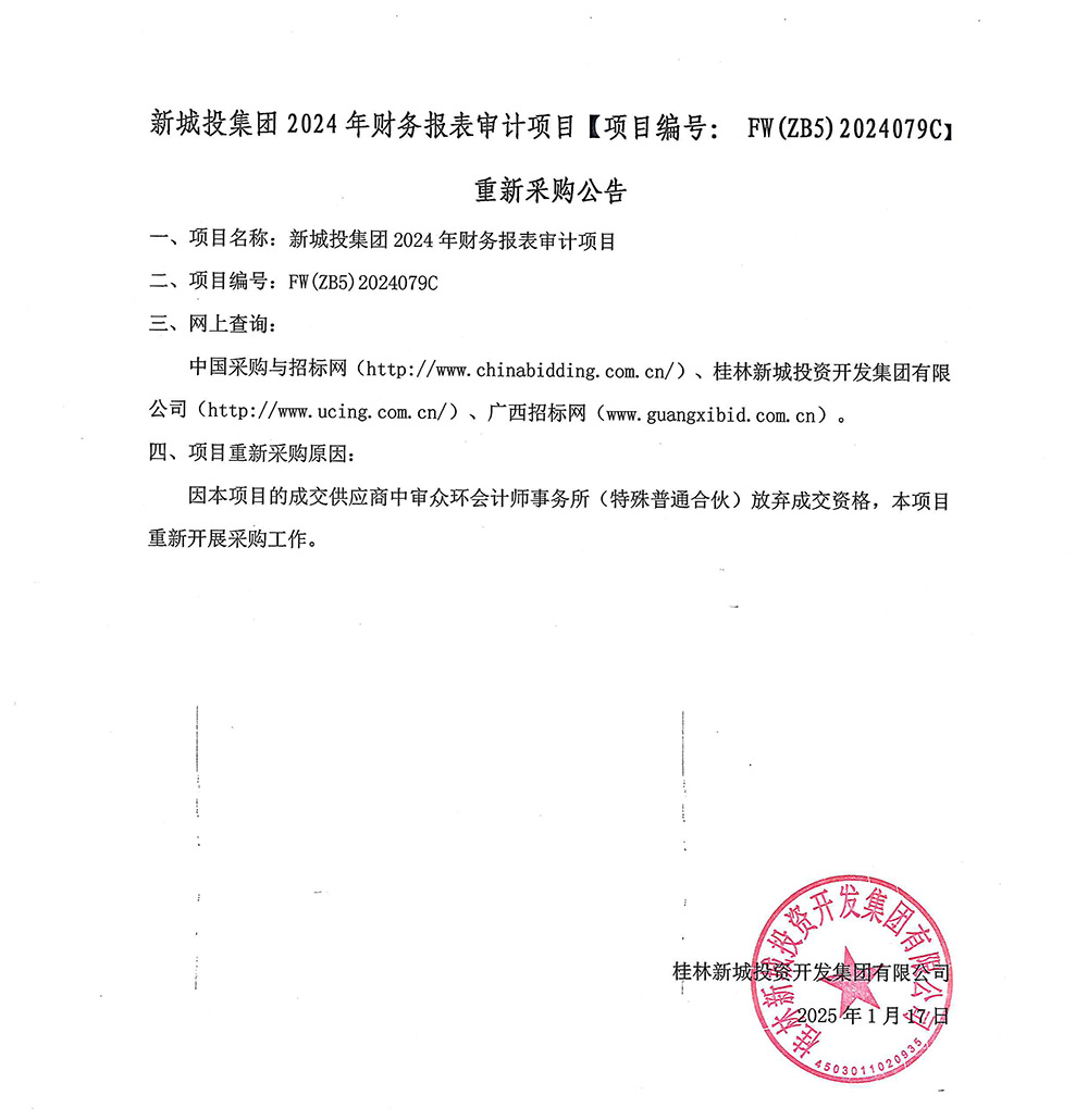新城投集團2024年財務(wù)報表審計項目【FW(ZB5)2024079C】重新采購公告